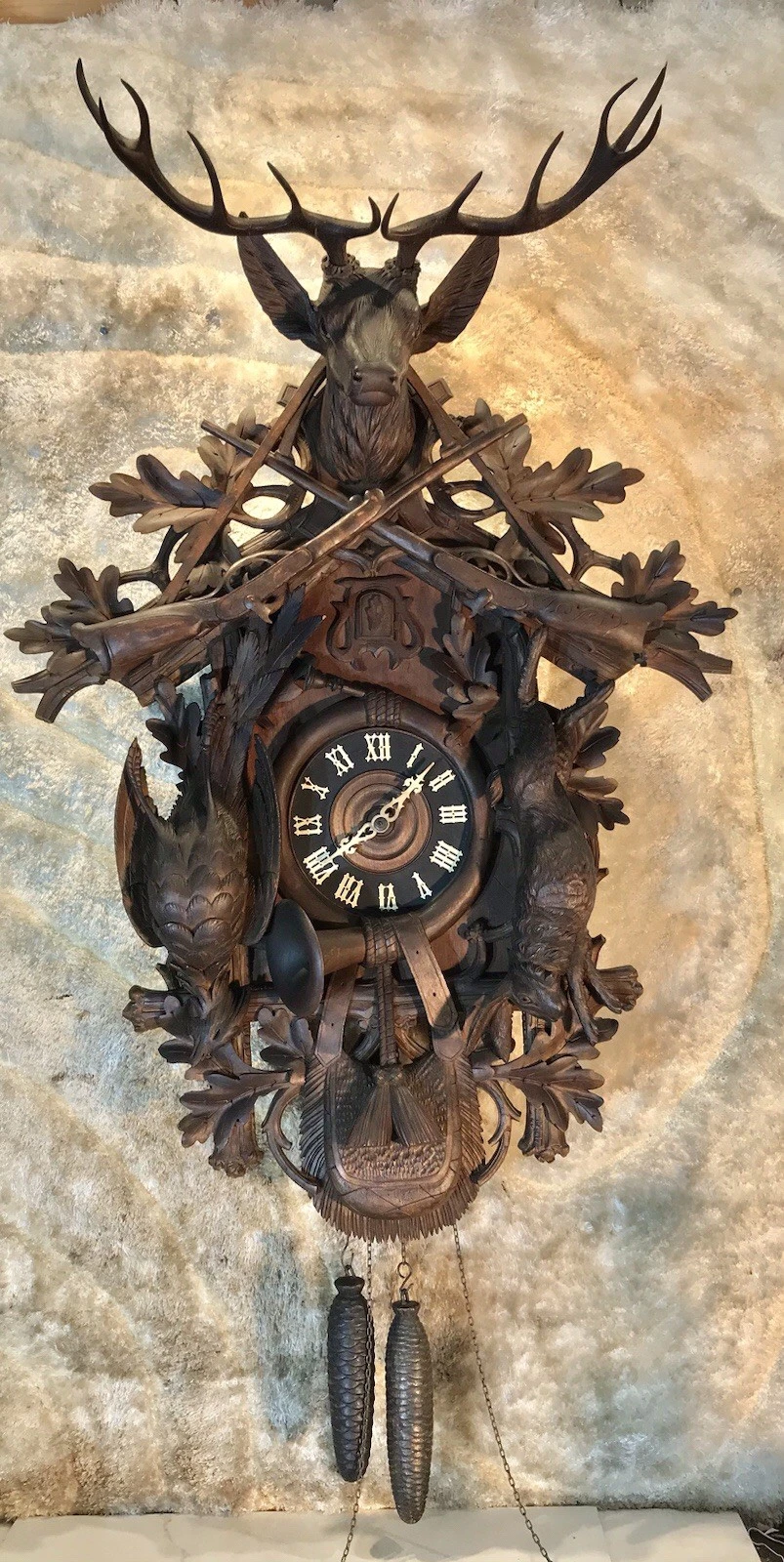 The clock coming with carving wood pendulum and two (2) weights and Germany mechanical movement and large antique Bird and carving beautiful hunting wood case And two (2) original large hands.